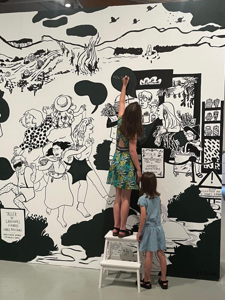 La ilustración forma parte del espacio de mediación de minipanera y se vincula a un taller de cómic que quiere poner de relieve como la cultura de la narración oral de las brujas, de los saberes fuera de la cristiandad, como la sabiduría de las herbolarias de montaña, como los cuerpos de gigantes, menairons, adivinos, mujeres de agua y otros seres describen el carácter y la forma de las tierras de Lleida y ponen de relieve prejuicios no siempre superados. Los huecos que los visitantes pueden completar añdiendo contenido con tiza quieren dar la oportunidad de construcción y revisión de narraciones y personajes desde imaginarios situados en el entorno de Lleida.